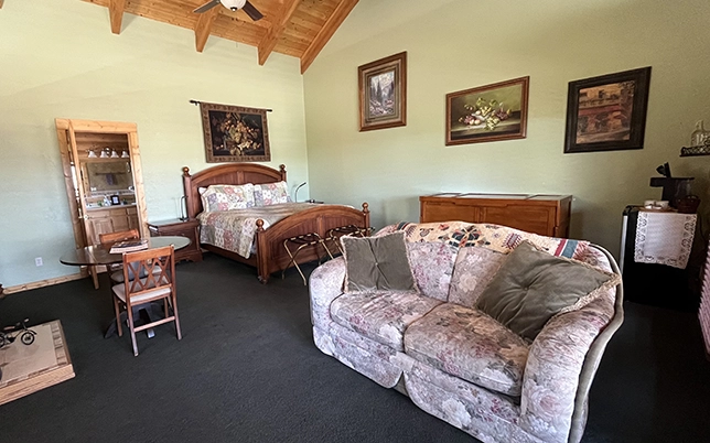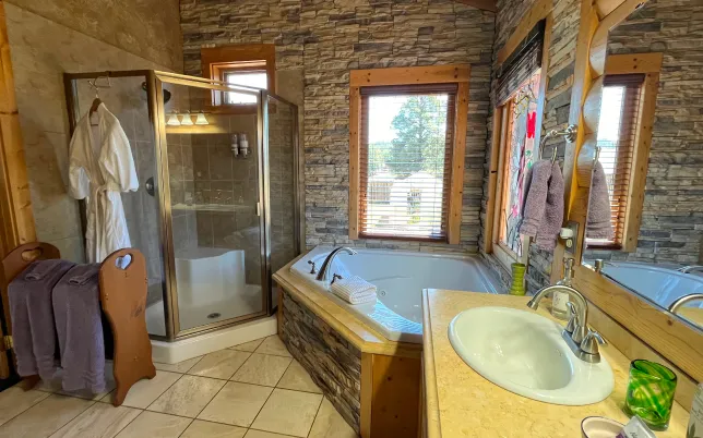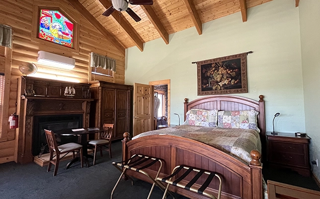 The San Juan Suite has a private entrance with direct access to the east side porch and beautiful views of the San Juan Mountains. It features a king-size bed and a Murphy queen-size bed, panoramic views, an oversized bathroom with a Jacuzzi bathtub, a large shower, and double sinks. The fireplace is a piece of artwork in its private sitting area. Perfect for a romantic getaway, yet it sleeps 4. Please note the price is for double occupancy.