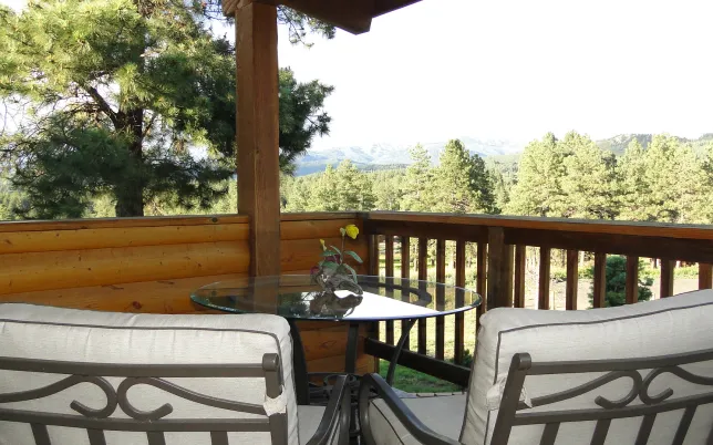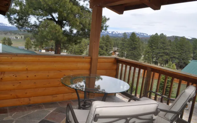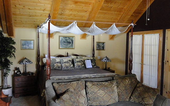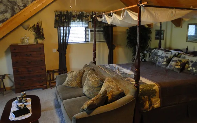 The Wilderness Loft Suite is thoughtfully designed to provide both luxury and comfort. Relax in a king-sized canopy bed, enjoy cozy evenings by the fireplace, or take in stunning views from your private balcony. Modern amenities such as air conditioning, Wi-Fi, refrigerator, Keurig coffee maker, smart TV, and access to our extensive movie library ensure a delightful and convenient stay at our Pagosa Springs bed and breakfast.
